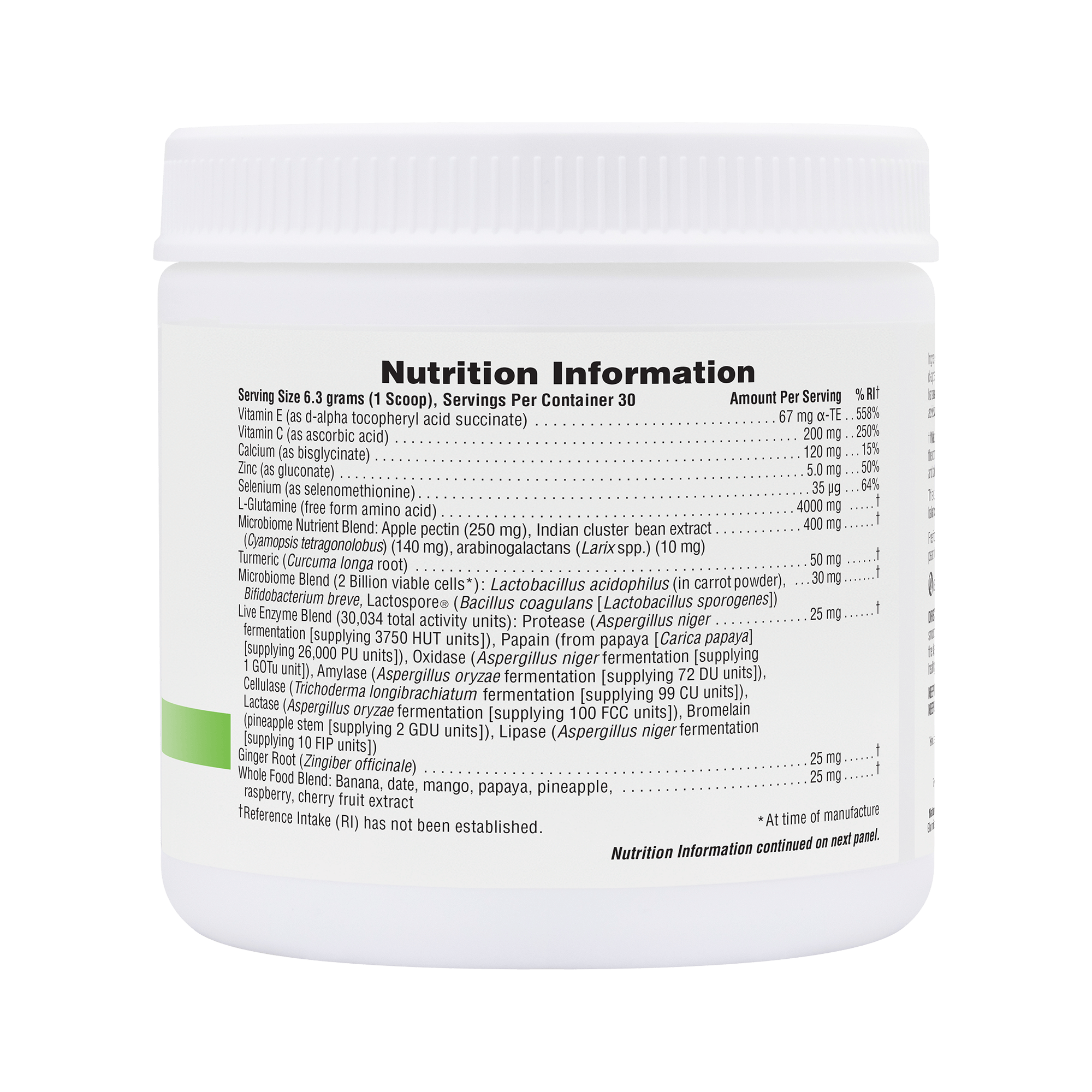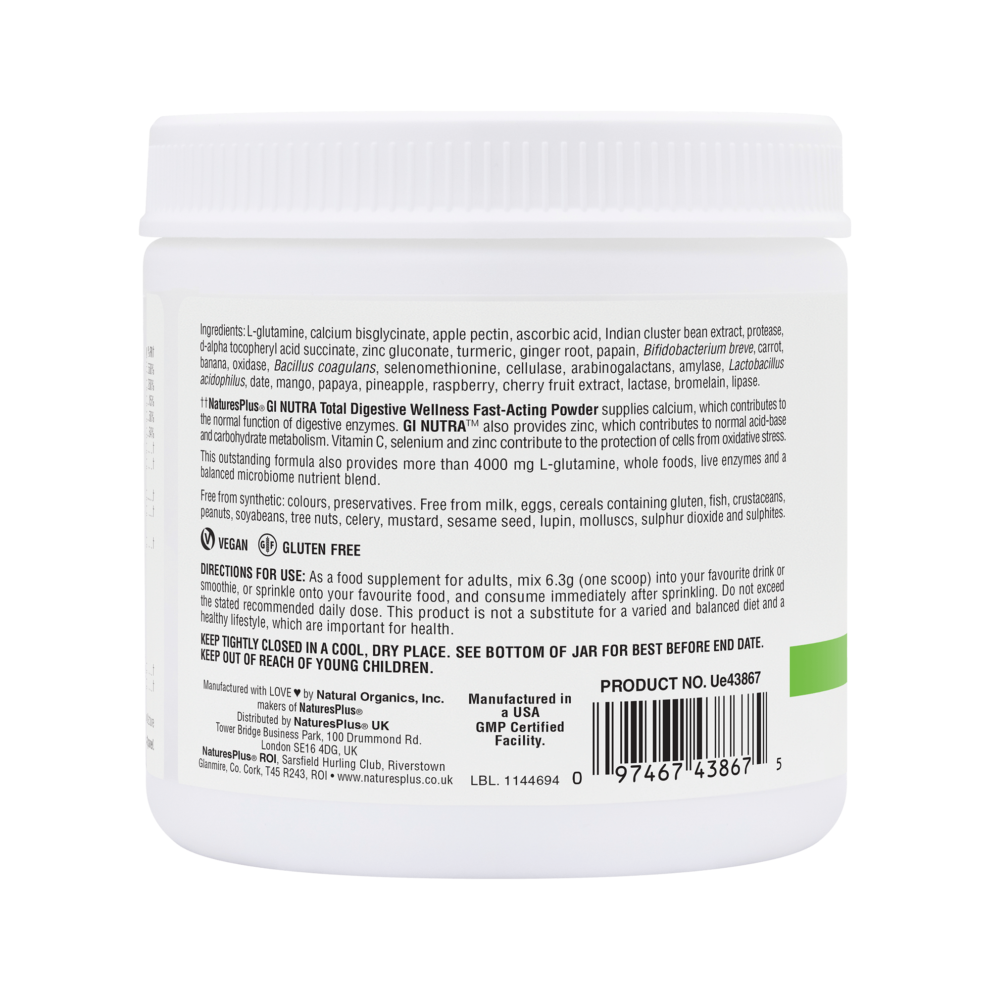 GI Nutra Total Digestive Wellness Fast Acting Powder Soothes. Heals. Rejuvenates. GI Nutra goes far beyond the many microflora, enzyme and health products on the market today. It features the nutritional support of 4000 mg of L-Glutamine, the recommended level for optimal results. It also supplies highly active microflora, whole food enzymes, prebiotic fibre and other essential co-factors as well as soothing ginger and turmeric. GI Nutra delivers powerful synergistic activity to ensure total digestive wellness.*†