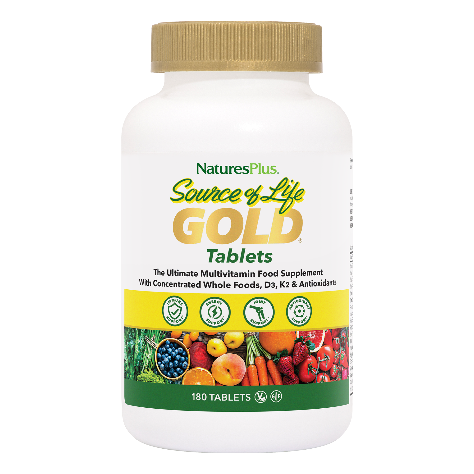Source of Life Gold is the most comprehensive and advanced whole food multivitamin supplement available. Revolutionary, all-natural ingredients with a unique blend of superfoods, energy enhancing* and immune supporting nutrients†. With more than 110 colorful fruits and vegetables, NaturesPlus pioneered the addition of synergistic whole food phytonutrients to vitamin and mineral supplements. Source of Life GOLD utilises OptiMicron Technology, which packs up to 10 times the nutrient concentration into each tablet, mini-tab or capsule while still dissolving rapidly for optimal absorption. The result is peak nutrition, increased energy* and life-enhancing benefits we all look for.